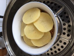 然后上锅,把土豆放在下面,土豆可以靠自己口味,加些盐,然后把肉均匀的铺在土豆上面,盖上锅,蒸上二十分钟,就可以出锅啦