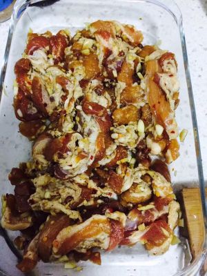 红薯紫薯去皮,切成块儿。五花肉切成薄片,放入盐、味极鲜、鸡精(少量,也可不放)、花椒、辣椒粉(按个人喜好放),全部拌匀之后,放置半小时,让其入味。