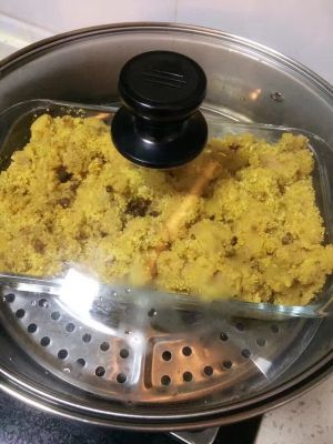 肉片铺在薯块儿上,冷水上锅蒸,蒸的具体时间我忘记了,大概40分钟左右吧,记得注意别把锅底水蒸干了。
