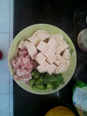 将豆腐切成小块,把五花肉切成细小的肉丁,青蒜苗切小段。