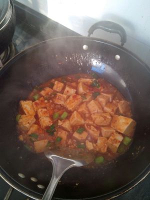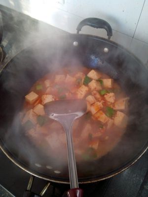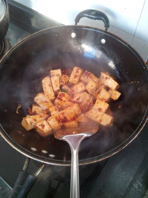 当调料炒出香味后,将豆腐放入锅内,拌匀加足量的水,小火烧制几分钟,最后将生粉汁加入收汁即可。
