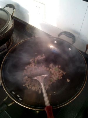 热锅,加入豆瓣酱和绞肉,稍加拌炒后加入辣椒粉和3克花椒粉