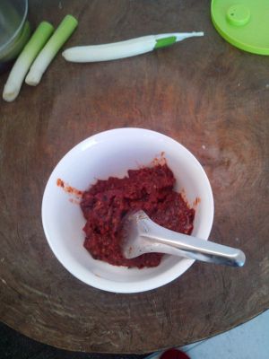 郫县豆瓣酱剁碎。一定要剁碎,不然1块1块的辣椒皮真的影响美观。