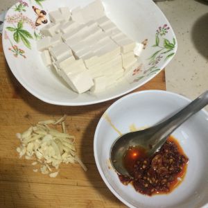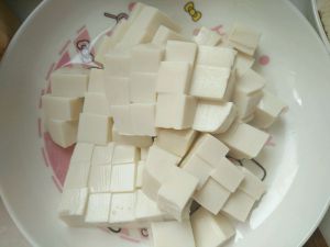 豆腐切小块,可以放冷水中加入一点盐浸泡一下,葱姜蒜切末备用。