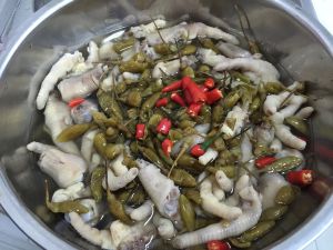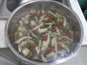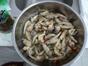 分别加入一勺盐、适量醋和料酒,以及泡椒、泡椒水、凉开水,直到鸡爪被完全淹没。