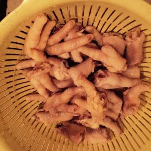 将煮好的鸡爪过冷水,多冲洗几次,挑去姜片等,沥干水。