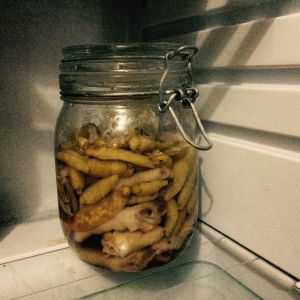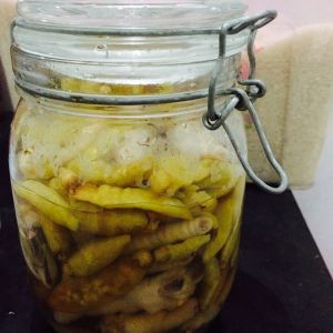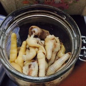 将冷却好的鸡爪码入干净无水的玻璃瓶或保鲜盒中。