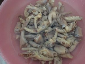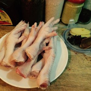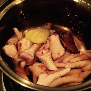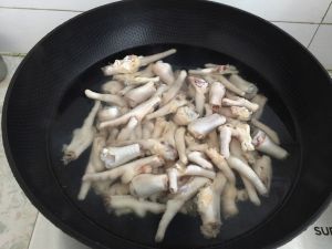 锅里倒入清水放些八角、生姜、小米椒,水沸腾、把凤叫放入锅中、放些生抽煮十分钟左右