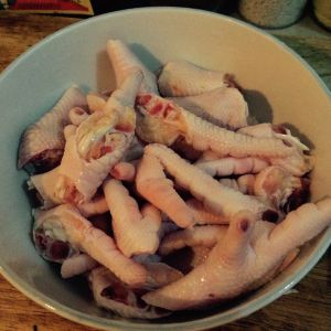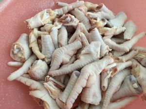 鸡爪切去指甲,每只切成三部分。先切两段,然后鸡掌一分为二。