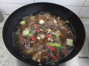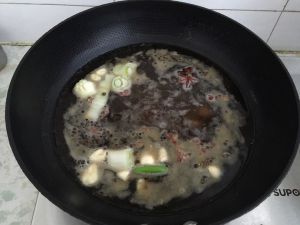 另起一锅水,放入葱姜蒜、盐、花椒、麻椒、大料、酱油