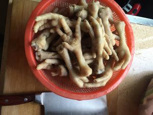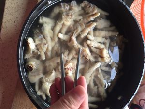 1.用清水洗净鸡爪,然后在清水中加入姜片以及适量料酒浸泡鸡爪两个小时 2.用剪子剪去指甲 3.用刀把鸡爪剁成小段,方便入味