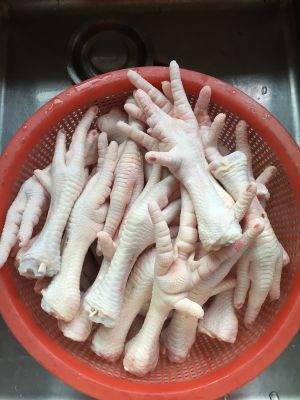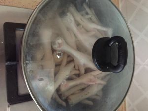 凤爪去掉指甲,中间切一刀,洗净,锅中放水一起烧,水开后洗净,再放水烧煮10分钟就差不多了,不要煮的时间太长,不然吃的时候没什么嚼头,不劲道了。