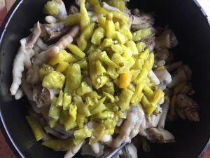 鸡爪沥干净水,加入糟卤,莫过鸡爪的量。根据个人口味加入适量泡椒,喜欢辣的可以把泡椒剪开。