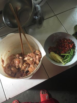 首先把鸡肉斩成小块,大概两三厘米大小,不要太大 不容易入味,只有在一堆辣椒里搜寻鸡肉才有感觉哈。抹味:白胡椒粉,盐,鸡精,料酒,酱油。腌制十分钟,时间长些也可以。