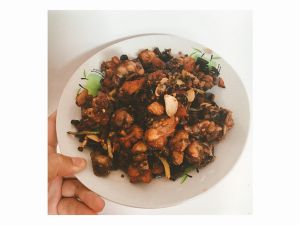 放少许油,加入姜蒜,再加入腌好的鸡肉丁,炒一会加入二荆条,香气扑鼻,灵机一动,加个老干妈吧,加了一小勺老干妈,出锅,好吃好吃
