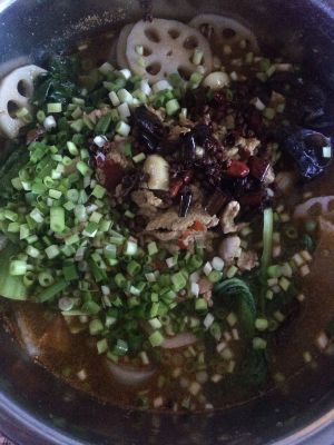 锅内放入色拉油烧热,放入聪姜蒜片,适量,出味后加入红油豆瓣炒香后加水适量,开后加入火锅料,把之前的里脊肉放入,开后加入调教后勾芡,装入容器,