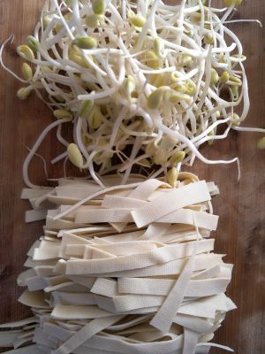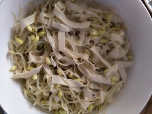 盛到之前准备好的豆芽和豆皮的碗里,正好盖住了豆芽和豆皮,这样蔬菜也能入味!上面撒一点葱花