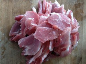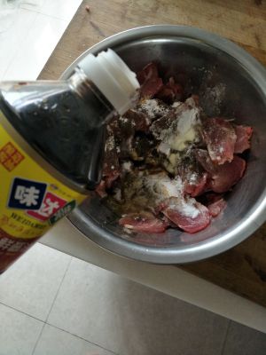 猪里脊切成薄片,用蚝油、酱油、水淀粉、蛋清抓匀,腌一个小时左右。
