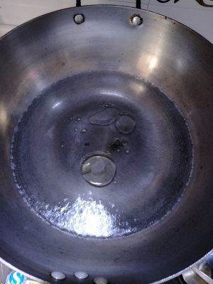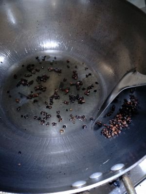 锅里烧上油,放入花椒和八角,小火慢慢烧,熬出香味,然后将油浇在葱蒜以及白芝麻上(刺啦……)大功告成!