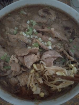 将肉片连汤倒入盛好豆芽和油菜的盆里,将切好的葱花、蒜末和白芝麻堆放在顶端。
