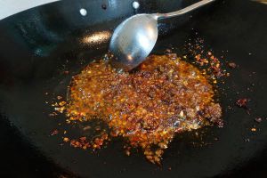 加入豆瓣酱煸炒,煸炒出香味后下豆豉煸炒,再加入姜末煸炒,放入辣椒面炒至油色红亮。