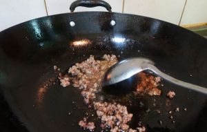 热锅放油,牛肉末煸炒至干,呈金黄色。