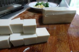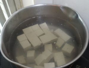 水烧开后,放一勺盐,将豆腐焯3-5分钟。