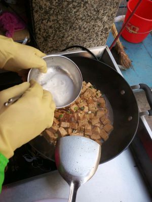 放豆腐块,闷煮5分钟,2小汤勺生粉兑水,导入锅中,轻轻推开豆腐