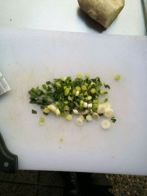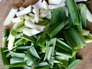 青蒜洗净,切1厘米长的段。(豆瓣酱和花椒粉忘拍了。)