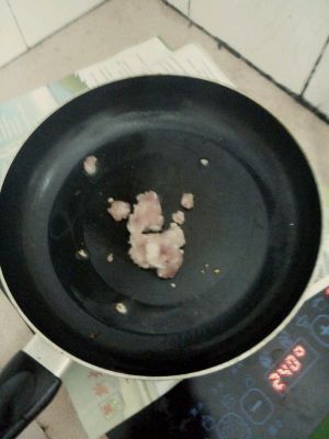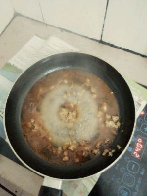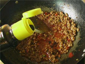 在油中放猪肉碎,炒熟后,2小汤勺郫县豆瓣酱,2碗水,煮开
