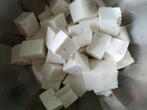 先把豆腐切成小正方体。放入锅中,不能沸水。