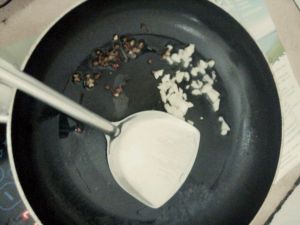 开火,放1/4碗油,花椒5g蒜末放进锅中翻炒,待炒出花椒味厚切,把花椒和蒜末撇出,留油
