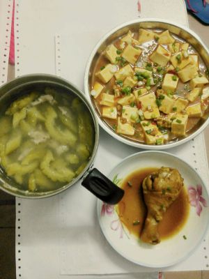 晚餐,苦瓜瘦肉汤,卤鸡腿,麻婆豆腐
