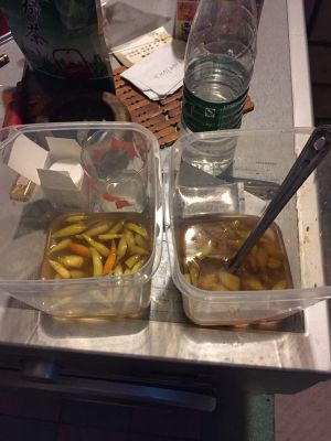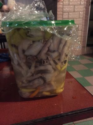 在密封的容器内加入泡椒两小瓶(剁小了更进味儿~)冰糖三颗,白酒两勺,泡菜水半碗,矿泉水适量(能淹没凤爪),盐3~4勺(感觉到稍微偏咸)。