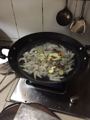 将凤爪洗净,可以适当斩小(方便泡入味道)现在热水中焯一遍,再放入锅中加入一小酌青花椒和红花椒,1~2颗八角,一片桂皮,2片香叶,两勺料酒,煮15分钟。