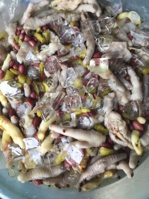 鸡爪装入容器中,倒入调好的调料,放入冰箱冷藏。