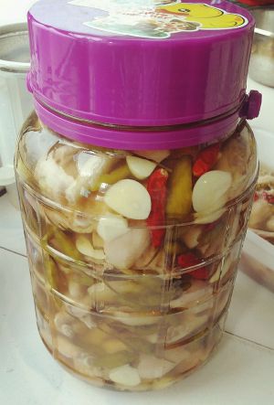 ② 大料 花椒 白醋 料酒(高度白酒)泡椒 小米椒 白糖 盐一点点 纯净水 放入容器里 密封 夏天入冰箱。24小时即可吃,但是三天入味更透。