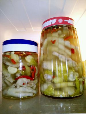 有泡菜水,可以盛出来现用。没有用凉开水加入白醋、盐、小米椒、朝天椒、蒜、糖、八角、花椒,搅匀
