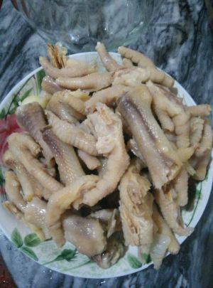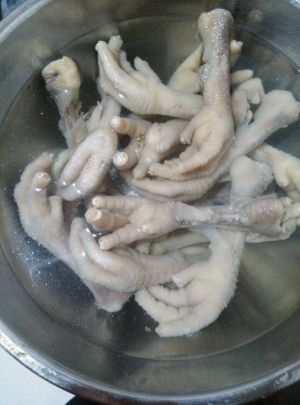 泡好的凤爪放上几片姜,加少许料酒,上锅煮,水开后煮10分钟,凤爪用筷子能扎透即可。捞出过凉。将凤爪切断,以便入味。