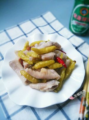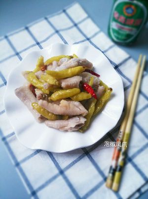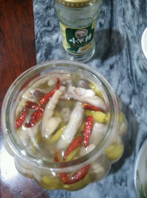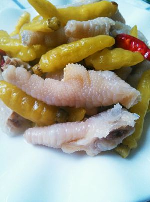 取一个干净的容器,把鸡爪,泡椒放进去,加入2碗凉白开水,以未过食材为准,1汤勺白酒,1汤勺白醋,1匙盐,红辣椒拌匀,放冰箱冷藏泡制一天即可食用。