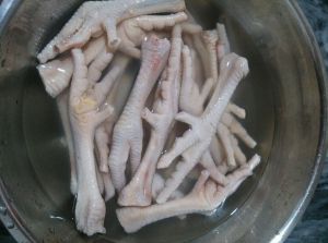 将凤爪洗净,用冷水浸泡,多换几次水,浆血水泡出。