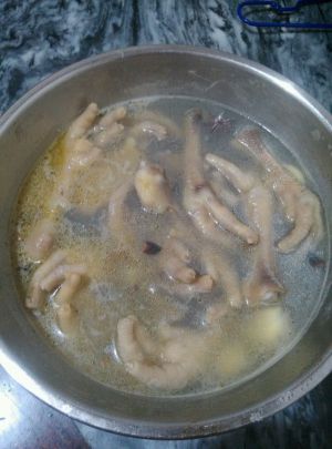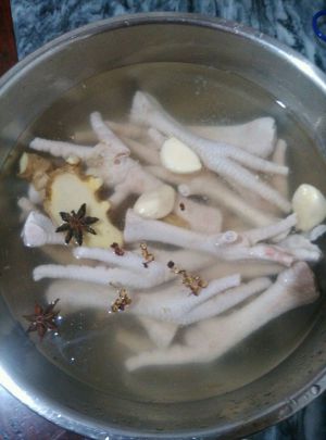 2:鸡爪加水,姜片,八角,花椒,料酒。