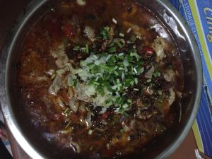 水再度烧开,把肉放入变色即可连汤倒入碗内,加上辣椒蒜末和香葱。