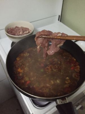 一块一块的划入肉片煮熟,煮的时间不宜太久,要保持肉软嫩