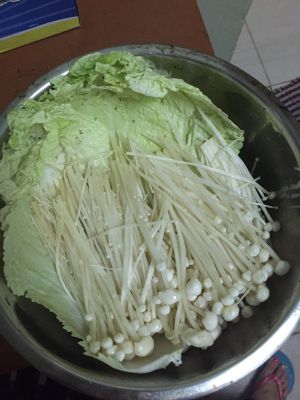 放入适量水,把白菜和金针磨倒入,白菜烫软即可放入准备放菜的碗底。