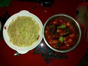 姜切片、土豆切片、豆皮切段,青椒切段,豆芽洗净,热锅放少许油,把这些蔬菜放入翻炒,加清水煮至断生,捞出铺在碗底,汤水留着备用