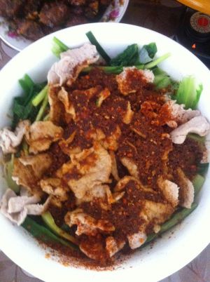 最后,关键来了!在所有煮好的材料上分别撒上辣椒面,花椒面,姜蒜,盐,然后锅里烧开约200g油,一定要多油!凉三秒,直接淋在菜碗里!成功!