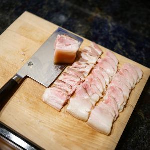 五花肉冷水下锅煮至7.8成熟捞出晾凉备用。