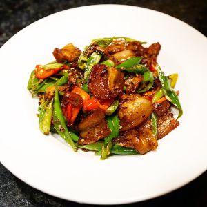 调制配料,将炒完肉后锅中的油,加上酱油,豆瓣,姜,蒜及适当豆豉,大火炒,待混合均匀后加入待用的肉和甜椒一起炒。如太干可适当加入一点水,待甜椒可用锅铲插入即可,约3~4分钟。