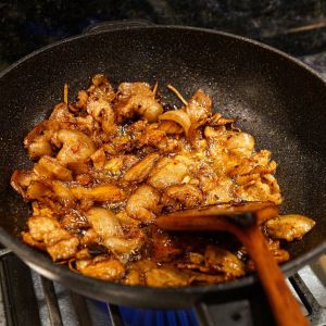 少油将肉炒至金黄色,或肉皮略有起小卷即可,放入盘中备用。